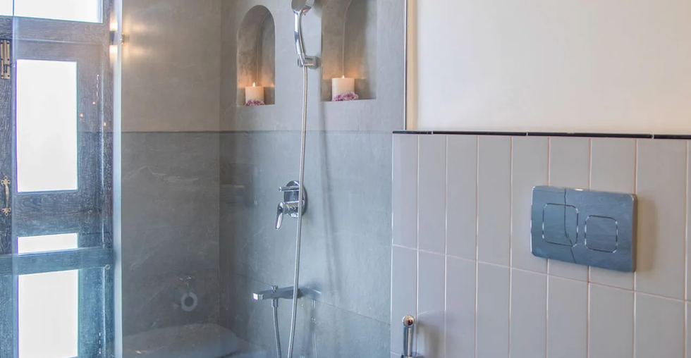 Features include glass-enclosed showers, premium fittings, and fresh towels.